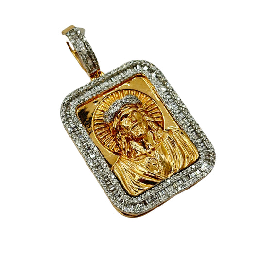 SOLID 14KT GOLD VVS-1 NATURAL DIAMOND JESUS BAGUETTE BORDER PENDANT