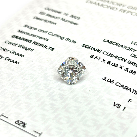 3.06CTW CUSHION-CUT F-COLOR / VS-1 IGI CERTIFIED LAB-GROWN DIAMOND