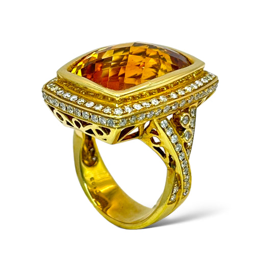 1/1 ESTATE 18KT YELLOW GOLD 18.00 CTW NATURAL CITRINE 1.10 CTW DIAMOND RING